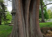 This tree is the Queen of the Swamp! Knees are the noted feature that allow the genus Taxodium to thrive in standing year-round water. These porous appendages connect to the roots and allow for aerobic respiration. The tallest knees grow off specimen around Cedar Lake in Section 21 but the state champ is across the road in Section 20 near the Fleischmann Mausoleum. They seem to get confused with Dawn Redwood but looking at the leaf and bud arrangement shows that they are alternately set on Baldcypress and oppositely set on the former. Baldcypress grow along the Atlantic and Gulf Coasts and up the Mississippi Valley into Indiana. The deep sinus fissures complicate the circumferential measurement but its recorded at 212-inches. The height measured 113-feet with a crown spread of 61-feet and a total of 340-points.