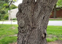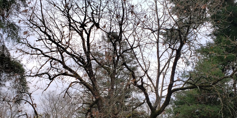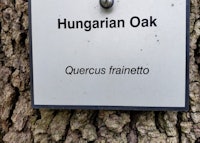 This oak is included with English Oak (Quercus robur), providing the lower tannin wood that produces French oak wine barrels. Looking at the champion specimen, one would question the use of this oak growing in its short branching habit for the wine industry. Being in the white oak group, this taxon has rounded leaf lobes with a leathery glossy texture seen in oak from warmer regimes. Hungarian oak has a wide range from Italy to the Caucasus in Turkey. If our specimen could grow straight and tall, it could reach 125-feet in height. Our specimen measured at a circumference of 93-inches, 34-feet in height, 38-feet in crown spread and rated at 136-points. The champion tree is located opposite the Garden Mausoleum near the west entrance to the gazebo in the Garden Courtyard. A companion specimen of similar habit is located at the northwest corner of Section 60 along the yellow painted line road.